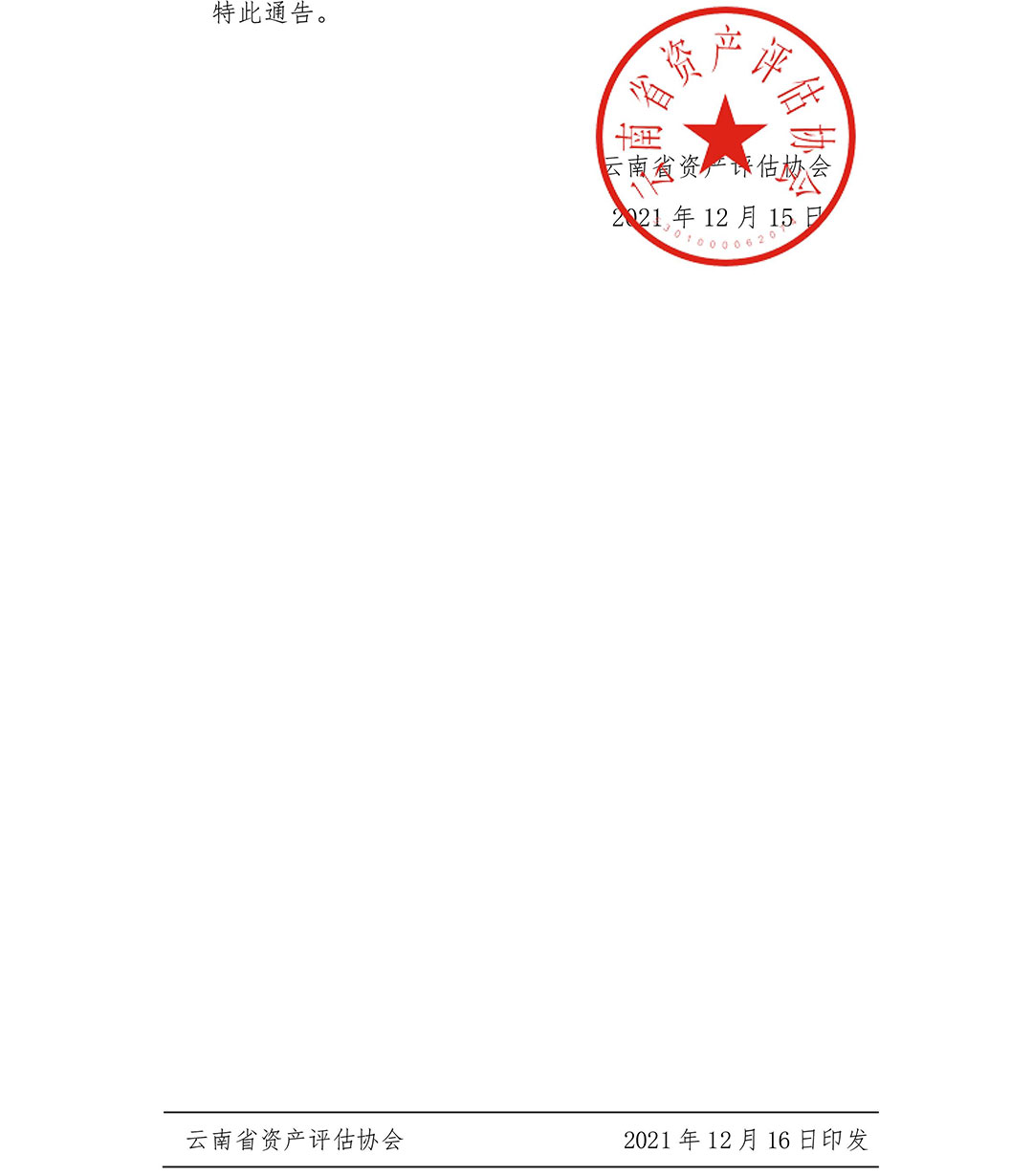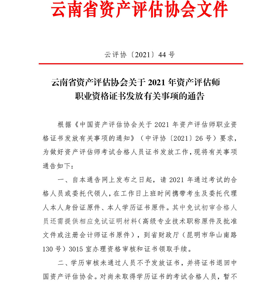 云南省資產(chǎn)評估協(xié)會關(guān)于2021年資產(chǎn)評估師職業(yè)資格證書發(fā)放有關(guān)事項的通告